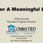 I also give talks and presentations at different venues, notably educational institutions both in Nepal and abroad about the caste system, compassion, (international) understanding and (world) peace. Of late, I have spoken at a number of institutions in Nepal, in Hong Kong and schools and tertiary educational institutions in the United States of America.