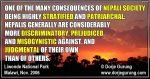 Self-segregation driven by expectations and pressure from the society and reinforced by members of the two inner circles help maintain the above division. In where we live, who we choose to socialize with at functions and events etc., Nepalis self-segregate along not only caste lines as well as status and hierarchy within the caste, but also class (which parallels caste, mostly), gender, and age brackets as well. Obviously, there’s more to that but it will have to wait until the follow-up blogs.