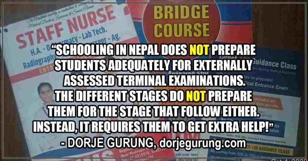 In other words, in Nepal, schooling neither prepares you adequately for externally assessed terminal examinations nor do the different stages prepare you for the stage that follow! What’s the point of such an education system?! I mean, what’s the point of an education system that requires you to take private tuition or extra classes to pass the terminal examinations, or one that requires you to take bridge courses to pass admission tests in order to continue your academic career?! Well, that’s one of the many sad consequences of an education system that imparts only the most basic of skills — the ability to memorize and regurgitate facts and figures. Another reason for that is the fact that education is an extremely lucrative business instead of the service it’s supposed to be. It goes without saying that a majority of you can’t afford private school education, forget private tuition and/or bridge courses!