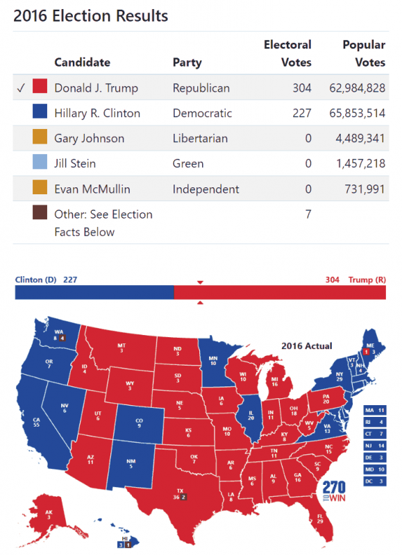 To demonstrate what I mean, let’s first have a look at the numbers from the 2016 election where Trump won the election in spite of getting 2.1% lower popular votes (see image below).
