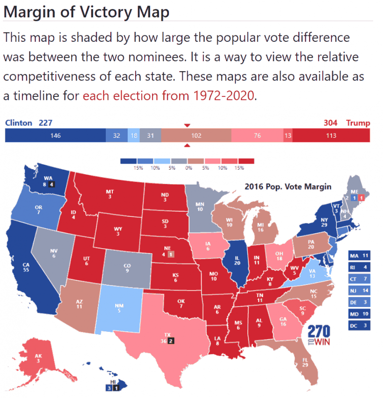 As you can see from the above map, in the 2016 Presidential Election cycle, there were states that clearly sided with the Democratic (deep Blue) or Republican (deep Red) party. Those are the ones with a popular vote margin of 15% or more. There were also States where the margin was small, less than 5% (light blue and light pink). The reasons for those results are simple: there are States that consistently lean towards one or the other party as well as those that don’t and so go back and forth.