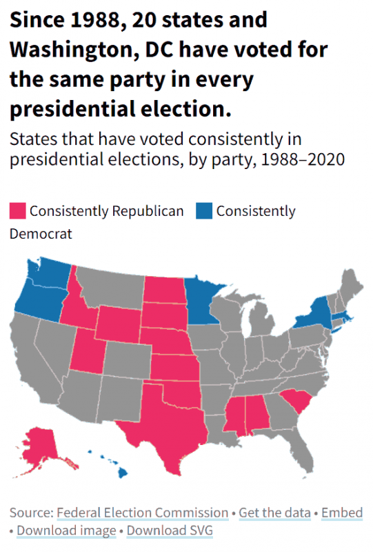 In the last nine Presidential Election, twenty States and Washington, DC have CONSISTENTLY voted for the same political party (see map below).