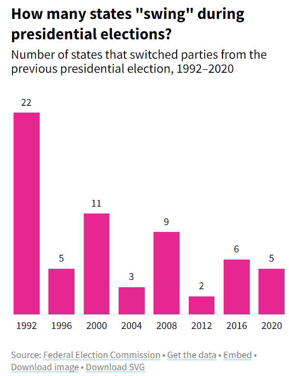 Swing states are ones where the voter allegiance to one party or the other is not guaranteed from one election cycle to the next. The following histogram shows the number of swing states by election year and, as you can see, the last few decades have seen quite a bit of variability in their numbers.