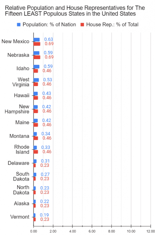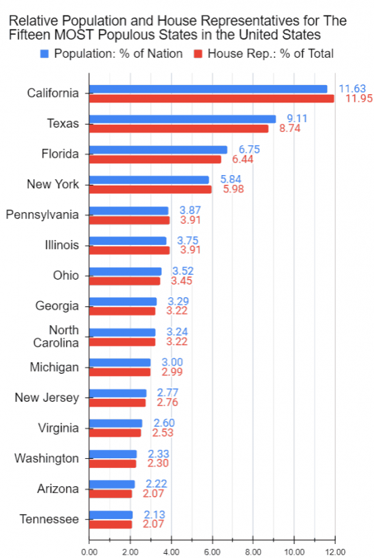 The most populous State of California, with an estimated population of almost thirty-nine million, for instance, will be represented by a total of fifty-two House of Representatives in the 119th Congress. Tennessee, with a population of about seven million, will be represented by a total of nine House of Representatives. The least populous State of Wyoming, with about half-a-million, on the other hand, will be represented by just one House of Representative. See the charts below for 1. the proportions of the state population relative to that of the nation and 2. the proportion of the House Representatives relative to that of the total (435).