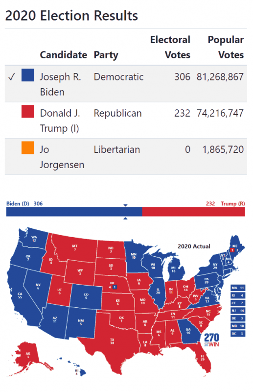 Also in the 2020 election, Biden won the popular votes by a clear margin of 4.5% representing over 7 million votes–equivalent to more than the total combined populations of the eight least populated states.