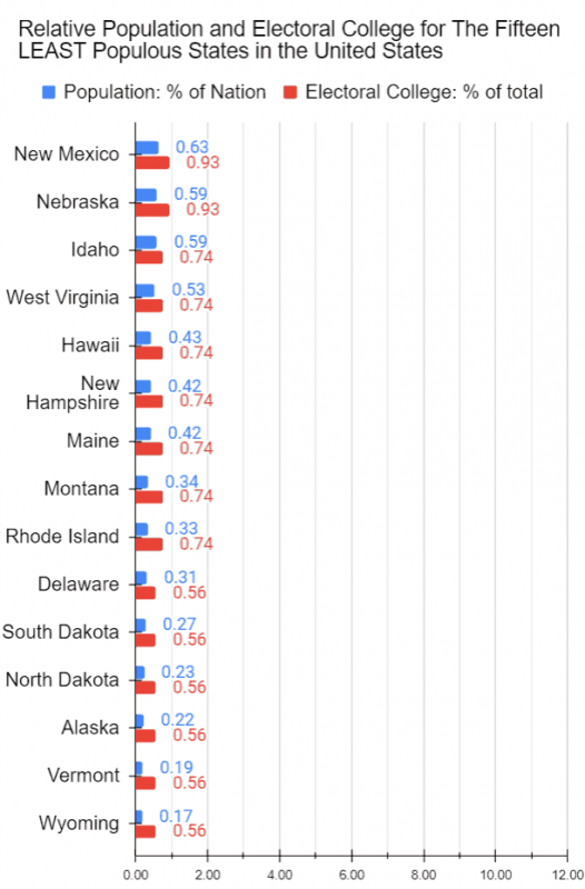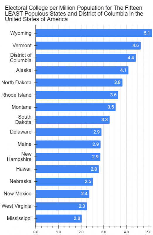 In fact, Electoral College per million population in Wyoming’s case is 5.1 much more than twice that of California at just 1.4 (see histograms below for more).