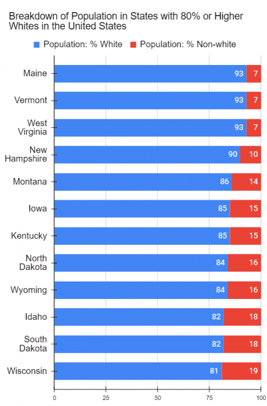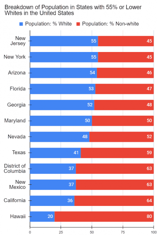 Furthermore, California, Texas, Florida, and New York are the four most populous States. With populations that are 64%, 59%, 47% and 45% non-whites respectively, their populations are also considerably more diverse than most others. In fact, their combined total population (112 million) is more than the combined total population of the twenty-seven Whitest states (109 million) (see histogram below).