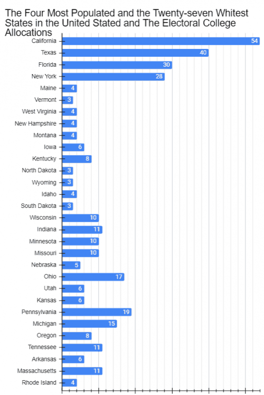 However, the Delegates for the four most populated states number only 152 while for the twenty-seven Whitest states they number 195 (see histogram below)!