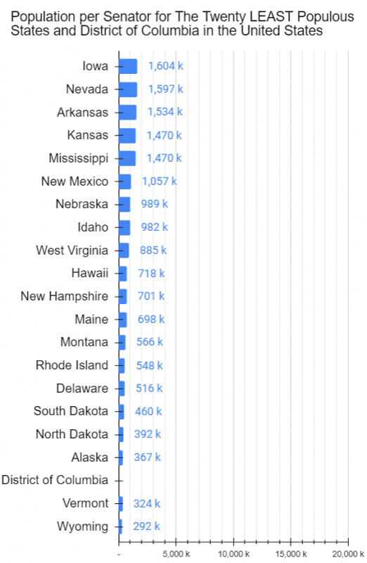 “The 25 most populous states contain nearly 84 percent of the 50 states’ total population. So 16 percent of the country controls half [–fifty–] of the seats in the United States Senate (and that’s not accounting for the fact that DC, Puerto Rico, and several other US territories have no representation at all in Congress).”