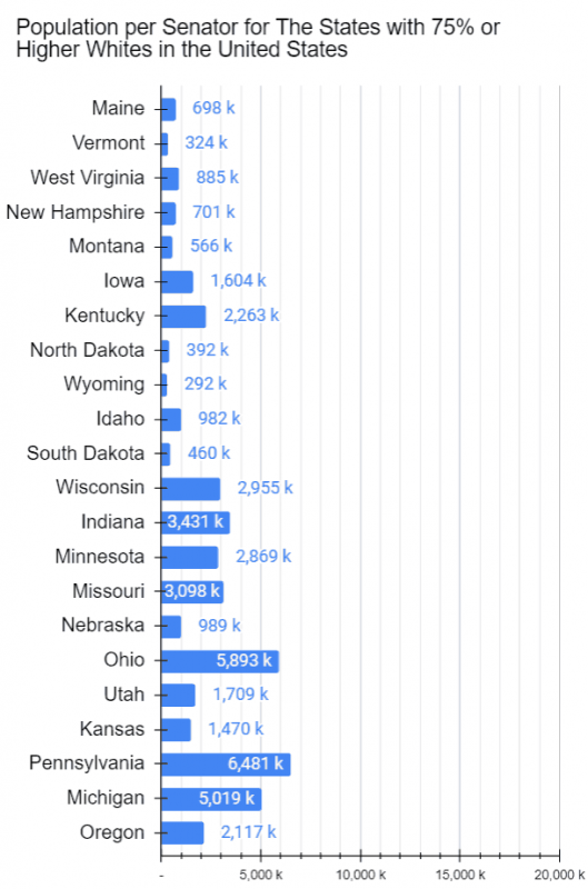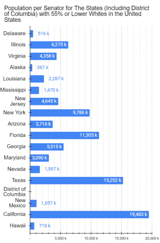 Let me once again remind you of the fact that the upper chamber, the Senate, consists of just 100 members, two from each of the 50 states. What that means is that, in the case of California, each Senator represents 19.5 million Californians. In Tennessee’s case, a Senator represent only 3.6 million Tennessean. In Wyoming’s case, a Senator represents only a quarter of a million Wyomingite. Since every single one of the 100 Senators has the same legislative power, that basically amounts to unequal representation–or rather lack of adequate representation for the non-white population of the United States. See histograms below for more.