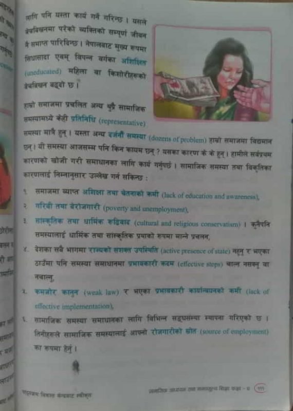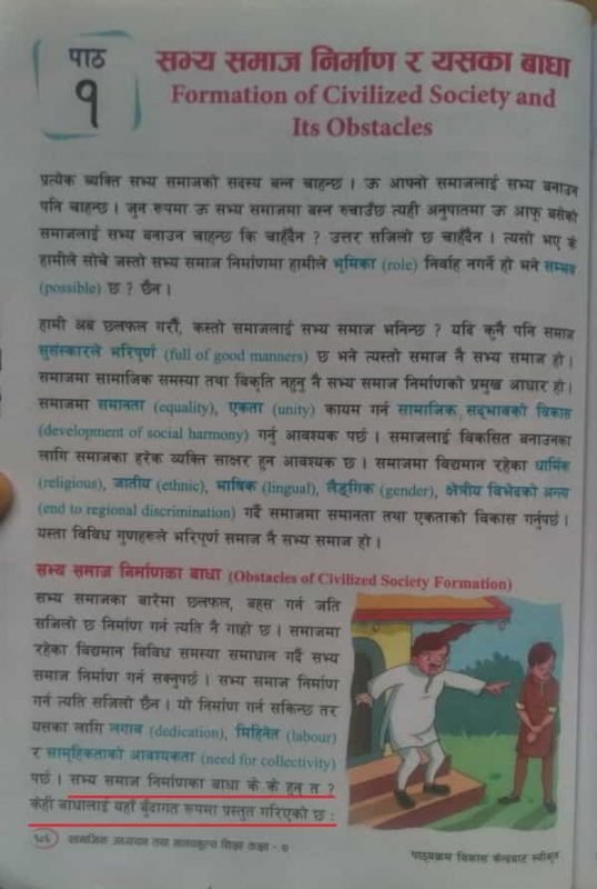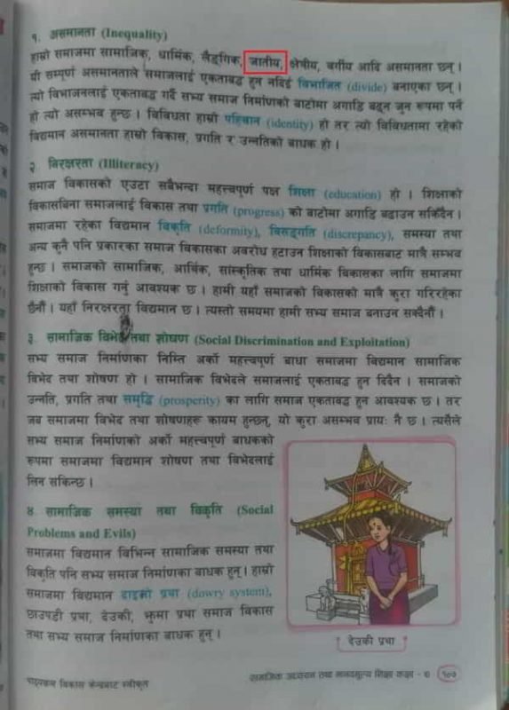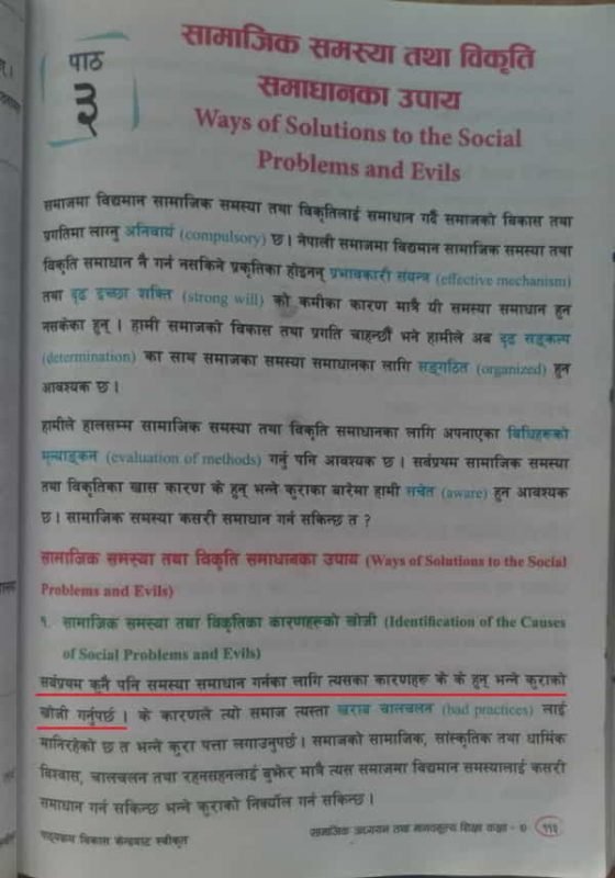 Sadly, Grade Seven Social Studies textbook does NOT even identify acknowledgment as the pre-requisite for tackling a social ill. The Grade Eight textbook is worse. It DENIES its existence by painting a wholly rosy but inaccurate picture of Nepali society and, in the process, gaslights those who suffer personally, socially, economically, and politically because of it.