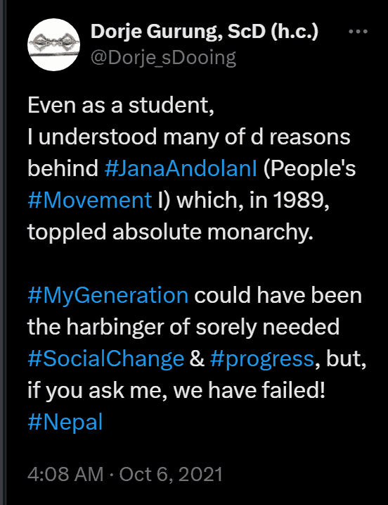 “The post below is from October 2021, bemoaning the failure of my generation, Generation X of Nepal. This past week, Generation Z stepped up and did what my generation was too chicken to do for over three decades, forget be what we could have become and what we could have done DURING those decades.