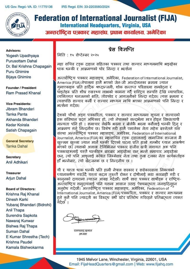 The Federation of International Journalist [sic], America (FIJA), Nepal Chapter, expresses heartfelt condolences for those who lost their lives during the recent Gen-Z movement, offers sympathy to the bereaved families, and wishes a speedy recovery to the injured. Furthermore, it condemns the damage to national property, business, and personal assets, as well as the acts of vandalism and attacks.