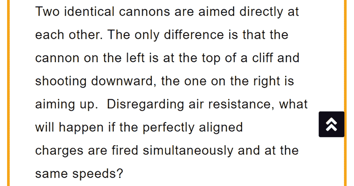 Two identical cannons are aimed directly at each other. The only difference is that the cannon on the left is at the top of a cliff and shooting downward, the one on the right is aiming up. Disregarding air resistance, what will happen if the perfectly aligned charges are fired simultaneously and at the same speeds?