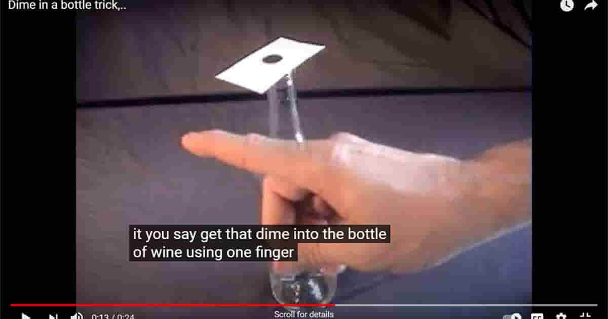 The video clip below, taken from Youtube demonstrates a well-known party trick. A coin is placed on a card and placed over the mouth of a bottle. Watch the video to see what happens when the card is flicked away with a finger.