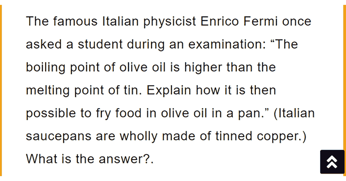 The famous Italian physicist Enrico Fermi once asked a student during an examination: “The boiling point of olive oil is higher than the melting point of tin. Explain how it is then possible to fry food in olive oil in a pan.” (Italian saucepans are wholly made of tinned copper.) What is the answer?.