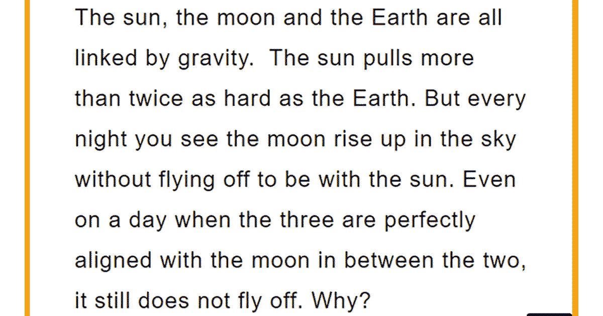 The sun, the moon and the Earth are all linked by gravity. The sun pulls more than twice as hard as the Earth. But every night you see the moon rise up in the sky without flying off to be with the sun. Even on a day when the three are perfectly aligned with the moon in between the two, it still does not fly off. Why?